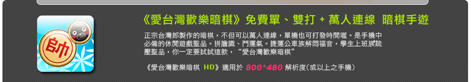 安裝方法非常簡單,只要您前往您App Store或Market搜尋"愛台灣歡樂暗棋" 就可以下載安裝最新版本的程式,Android玩家也可由此 下載檔案 ,然後複製到您 手機的SDCard即可完成安裝。注意Android需求至少為 2.2(含) 以上