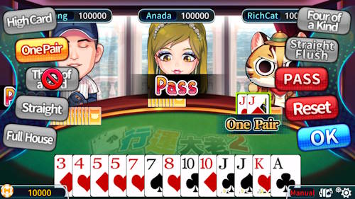 當你喊出“PASS”後,任何形況下皆不可以再丟牌,需等到又有兩個玩家也“PASS”最後一個玩家重新丟牌後,才能再丟牌。但有例外,當你擁有鐵支或同花順時,任何時候皆可丟牌。