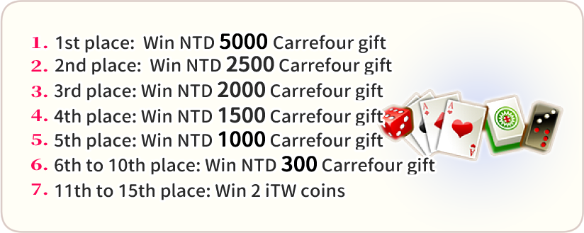 8、A NT$300 Carrefour gift voucher will be awarded for Special Hand Types achieved in the Event Lobby.